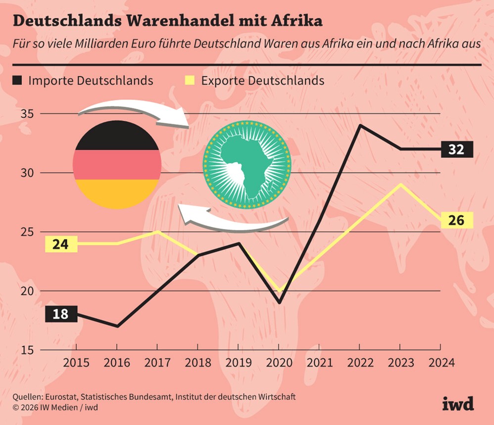 Mit unserer Unterstützung verstehen wir uns auch Brückenbauer zwischen Gegenwart und Zukunft in Europa und Afrika. Zwar ist die EU bereits heute der wichtigste Handelspartner Afrikas, allerdings sind die Warenströme vergleichsweise klein. Angesichts zunehmender weltweiter geopolitischer Spannungen und Abhängigkeiten sollten Brüssel und Berlin die Handelsbeziehungen zum afrikanischen Kontinent weiter ausbauen, empfiehlt aktuell das Institut der deutschen Wirtschaft (IW).