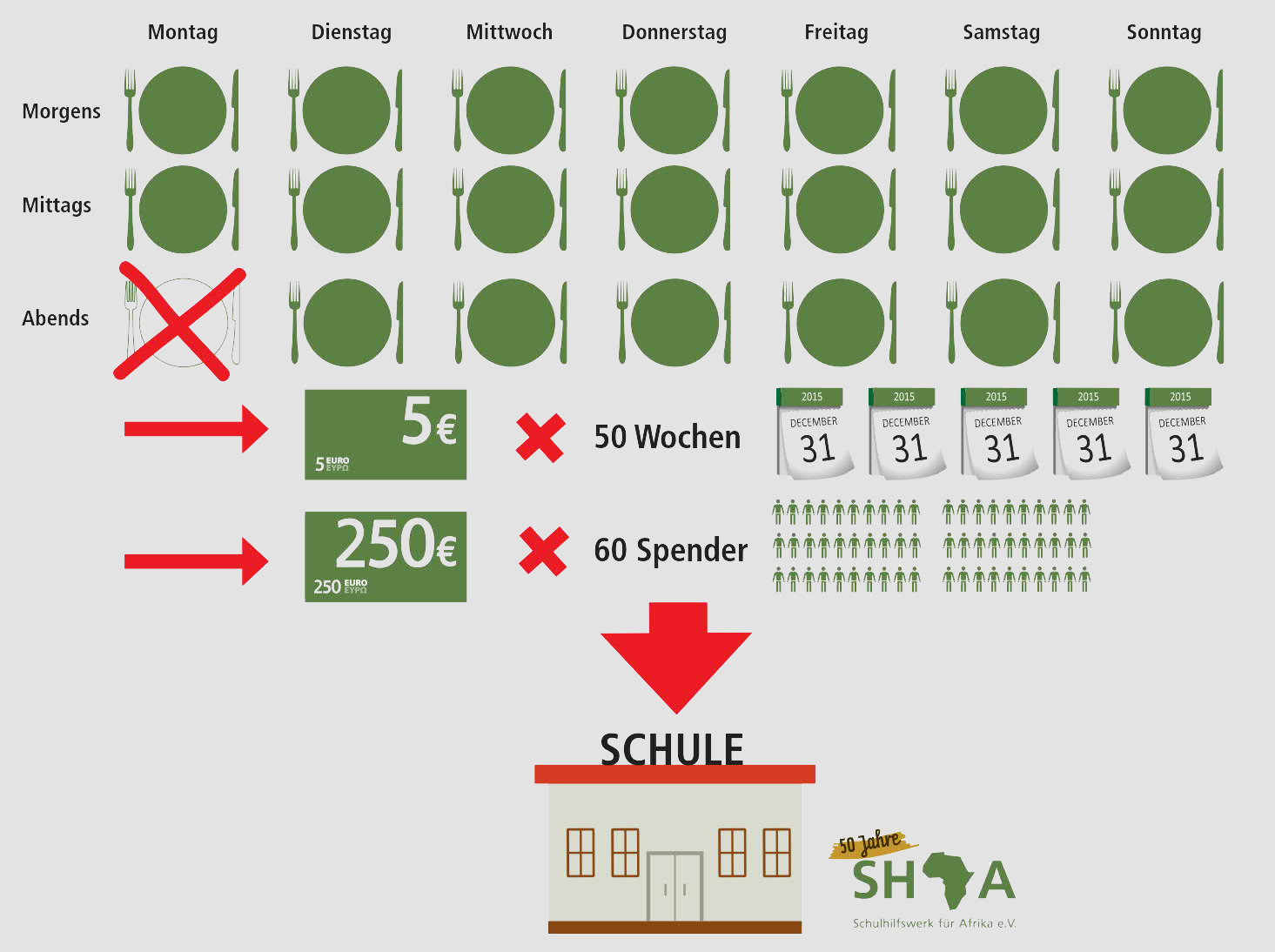 Wenn wir auf eine der 21 Mahlzeiten in der Woche verzichten und dafür 5 Euro zur Seite legen sowie dies ein Jahr zur Seite legen, dann braucht es nur 60 von uns, um in Afrika ein Schulhaus zu bauen, das über viele Jahre hinweg Hunderten von jungen Menschen ein ordentliches Lernen ermöglicht. Die eine Mahlzeit weniger wird hierzulande keinen hungern lassen (im Gegenteil: für die Fastenzeit ist sie ein sehr praktischer Ansatz), gleichzeitig aber dauerhaft den Bildungshunger vieler junger Afrikanerinnen und Afrikaner stillen. Nicht zuletzt erhalten sie dadurch Grundlage und Perspektiven, um ihr eigenes Schicksal in die Hand zu nehmen und ihre Heimat weiterzuentwickeln. Wir würden uns freuen, wenn Ihnen unsere Idee gefällt – vielleicht wollen Sie sie ja auch mit anderen teilen (auch auf Facebook).